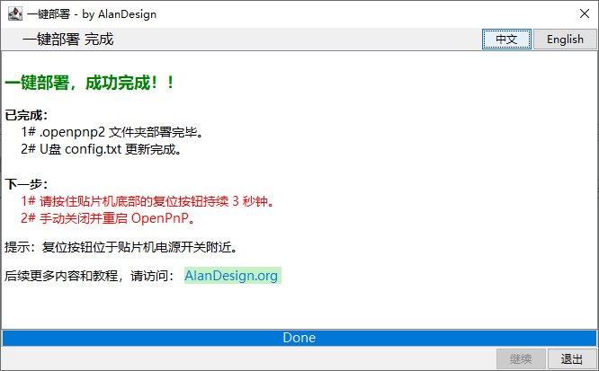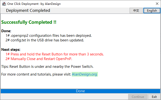 根据界面提示,长按复位开关 3 秒钟,并重新启动 OpenPnP 软件以完成全部配置流程。